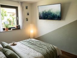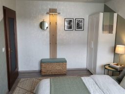 ist ein liebevoll eingerichtetes Zimmer mit zwei modernen 140x200cm Bett und einem funktionalem Schreibtisch und einem Kleiderschrank. Das Zimmer verfügt über einen Smart TV in 75 Zoll. Das Zimmer hat Fußbodenheizung und Gardinen zum Verdunkeln.